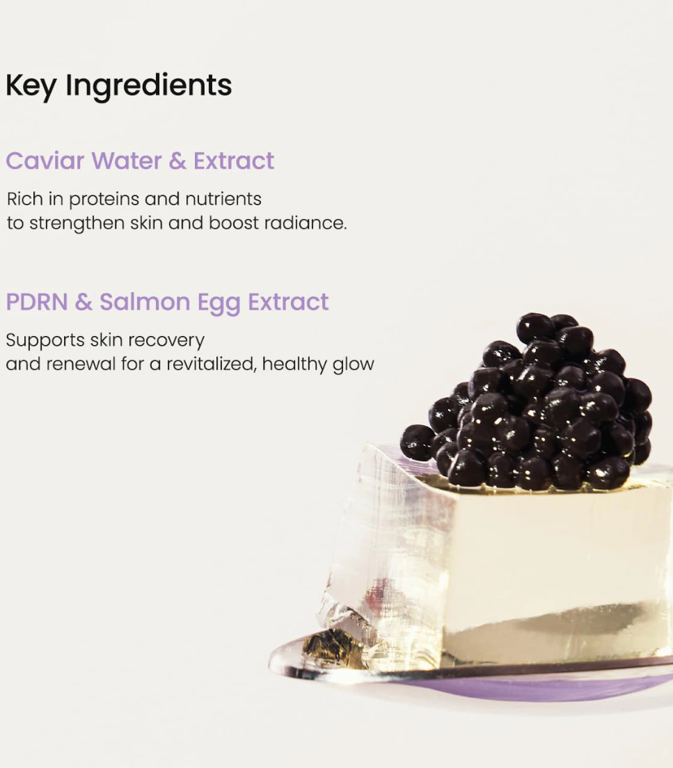Doble acción Caviar + PDRN: Aporta proteínas, aminoácidos y nutrientes esenciales para restaurar la vitalidad y reforzar la piel.