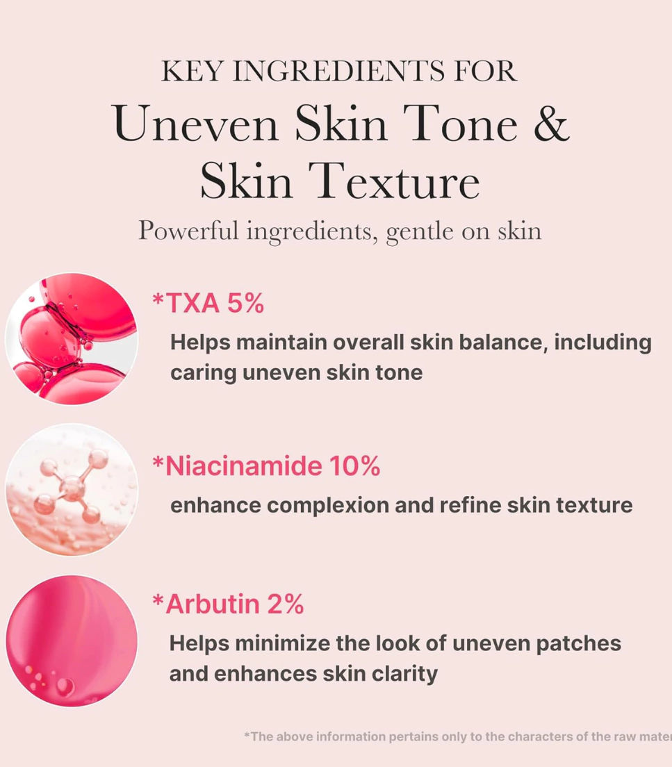 Tratamiento intensivo de manchas y tono desigual: Elaborado con 5% de ácido tranexámico (TXA), la concentración máxima según los estándares de la marca para cuidado post-manchas.